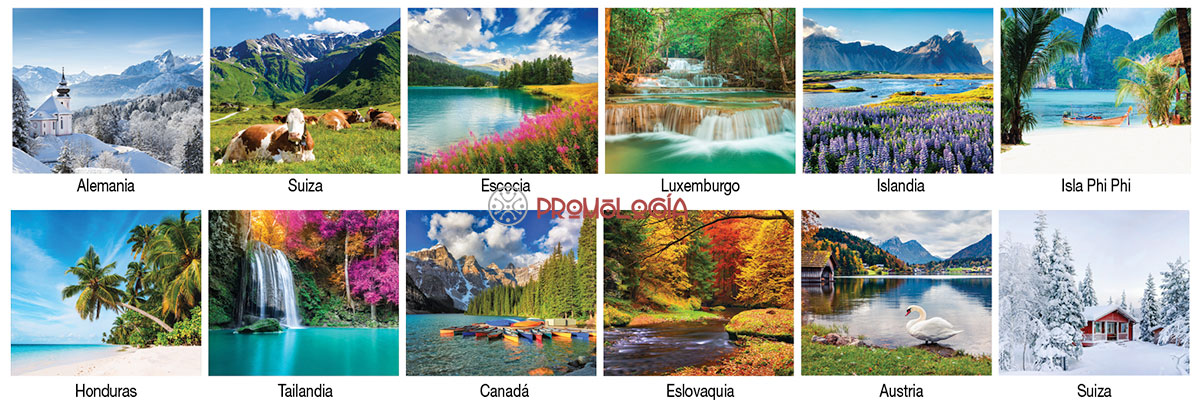Con imágenes de paisajes internacionales. Por el anverso de cada lámina se ve el mes; por el reverso se ve la imagen.